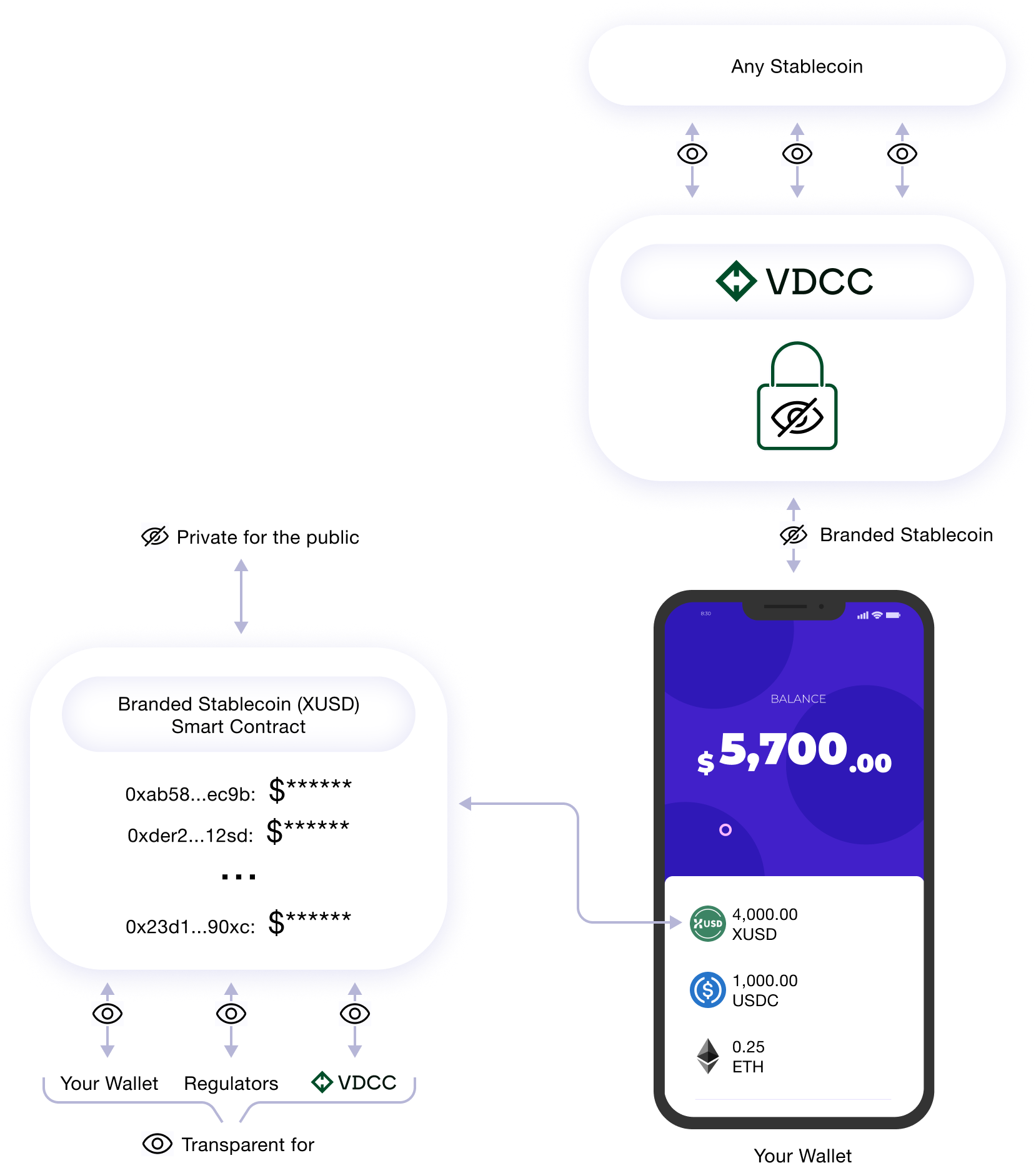 All Branded Stablecoins can be launched as private stablecoins, enabling users to keep their balances private on public blockchains. The design ensures regulatory compliance, offering visibility to law enforcement and regulators when required.